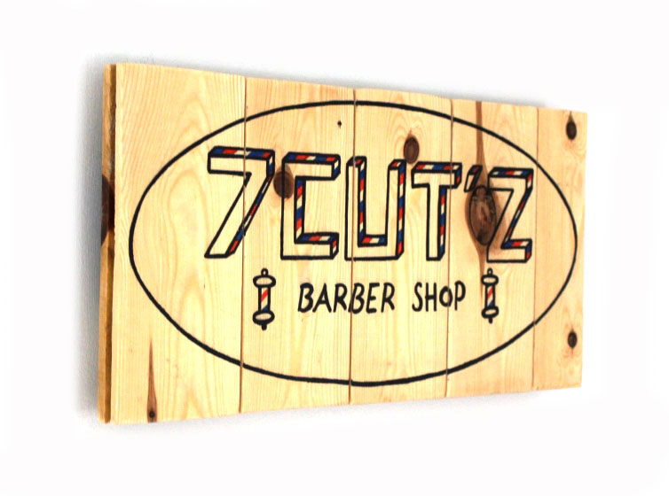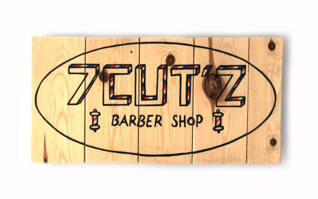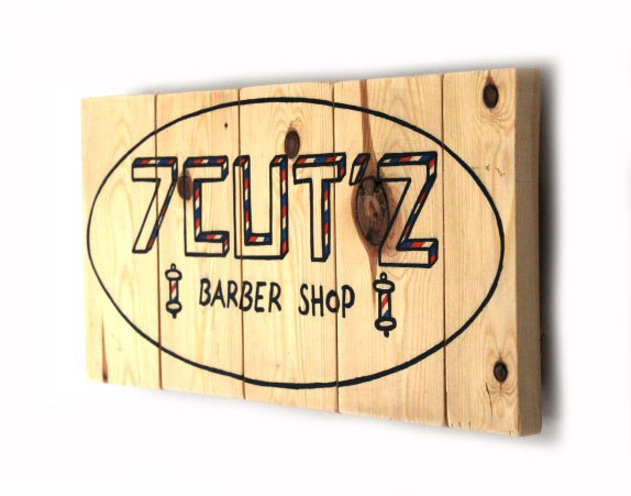 Description : enseigne d’un nouveau salon de coiffure – peinture et Posca sur bois de plancher 40x20cm, sur base d’un logo réalisé à la main