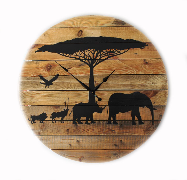 Description : Horloge représentant cinq animaux de la savanne d’Afrique (un éléphant, un rhinocéros, une antilope, un lion et un rapace). Peinture et Posca sur bois de palettes.