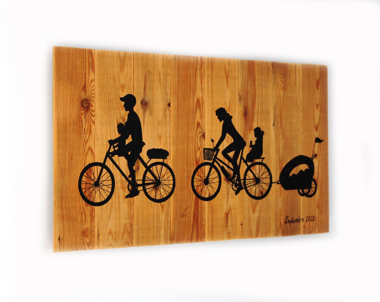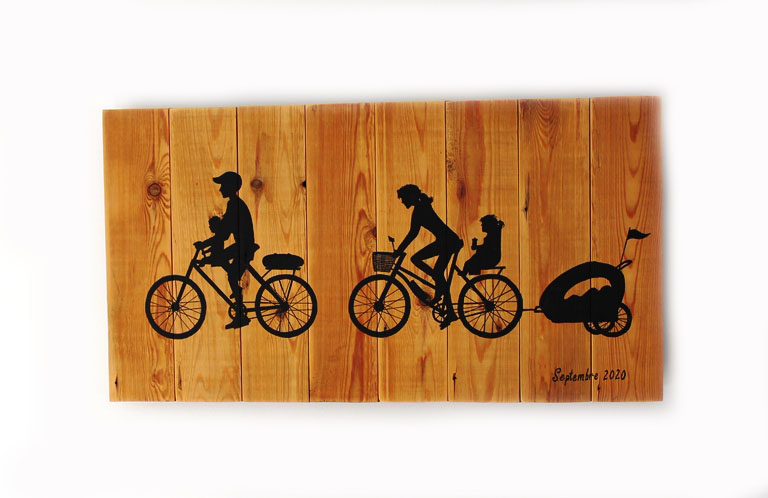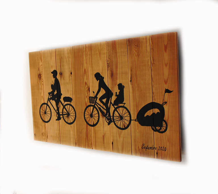 Description : peinture et Posca sur bois de plancher 65x40cm, motif personnalisé sur base de photos