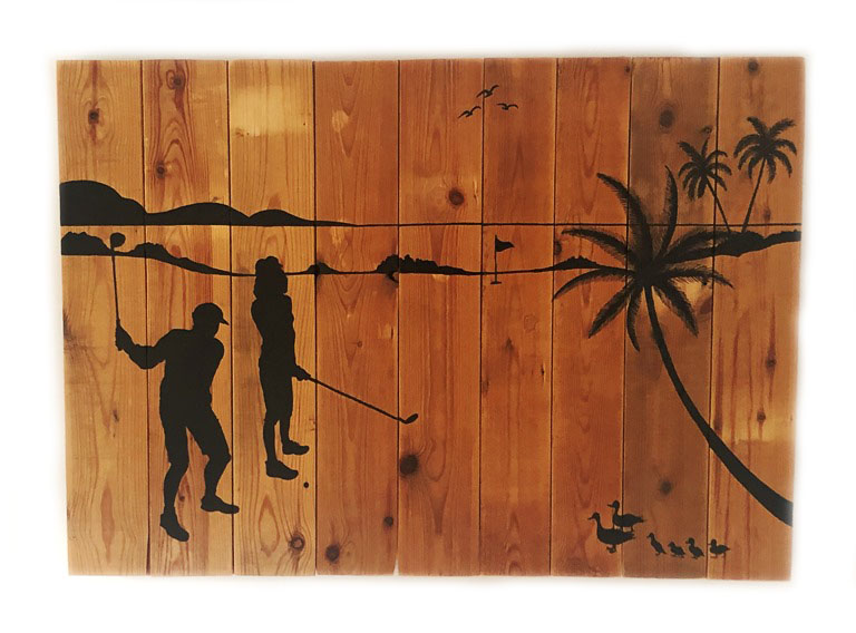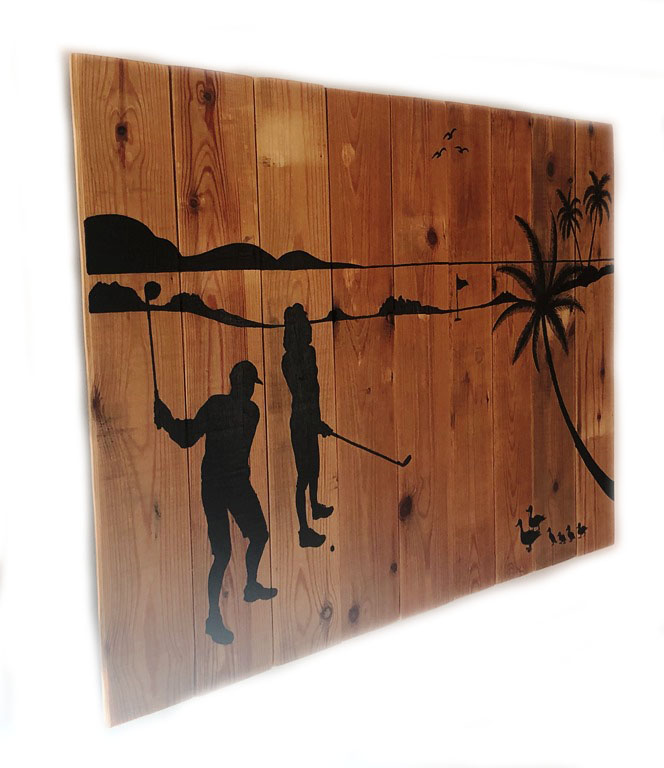 Description : peinture et Posca sur bois de plancher 80x60cm, motif personnalisé sur base de photos