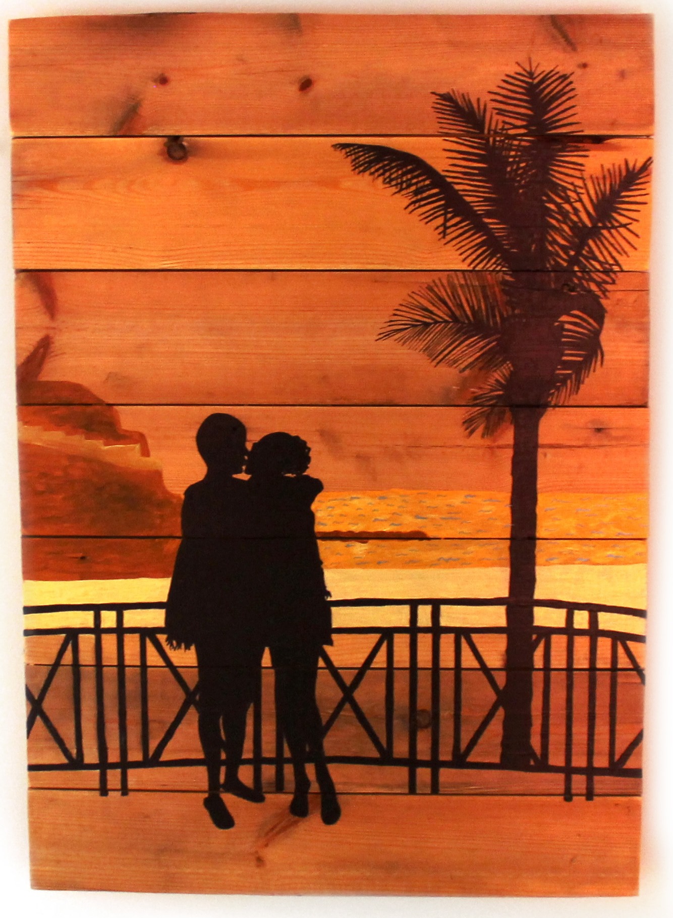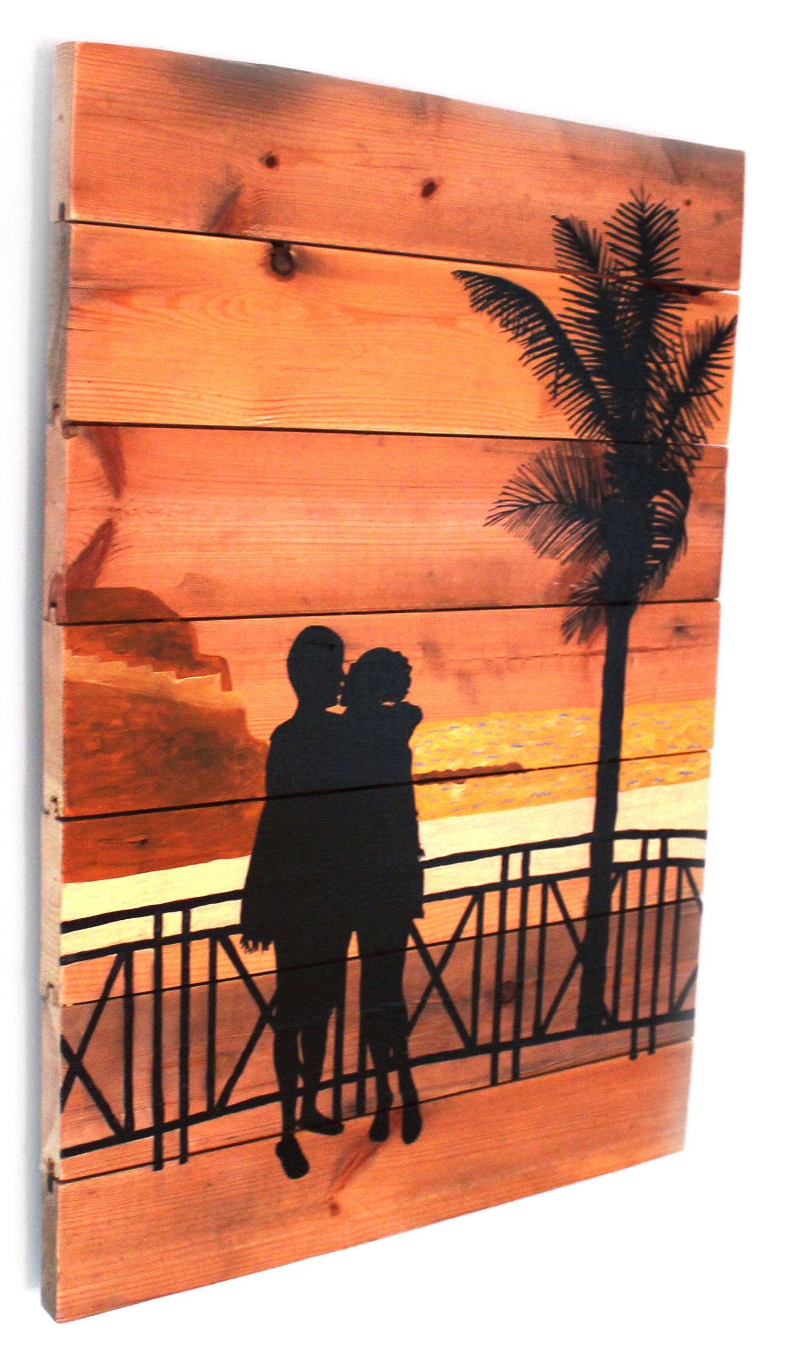 Description : peinture et Posca sur bois de plancher 60x42cm, personnages peints sur base d’une photo