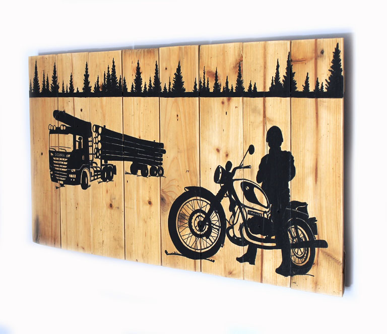 Description : peinture et Posca sur bois de plancher 65x40cm, motif personnalisé sur base de photos