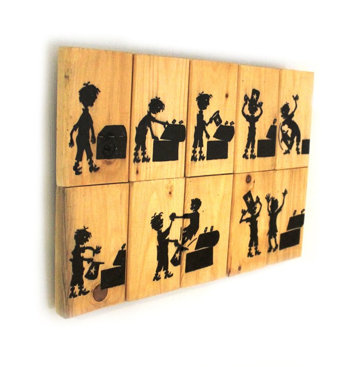 Description : réalisation d’une bande-dessinée avec peinture et Posca sur bois de sommier 37x25cm